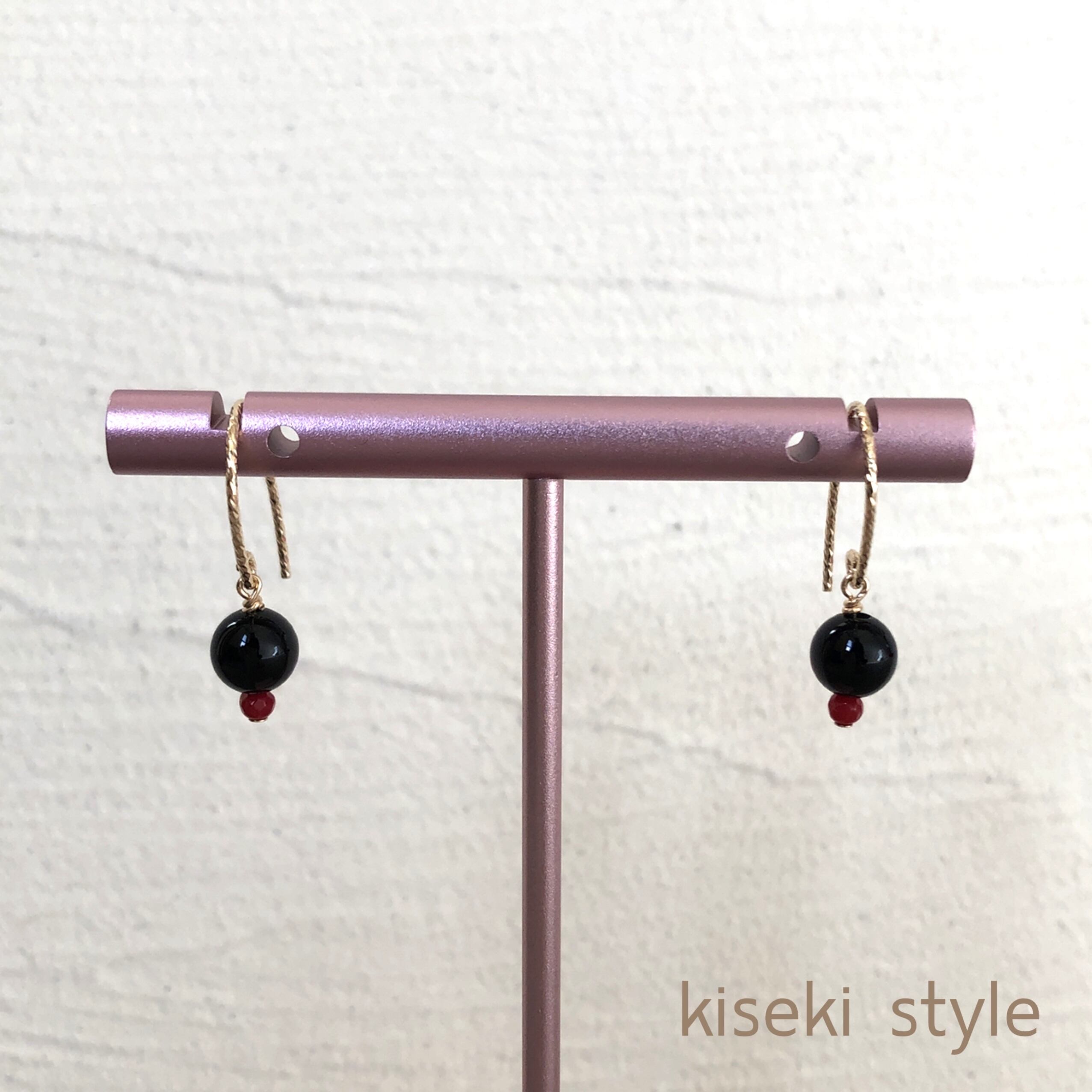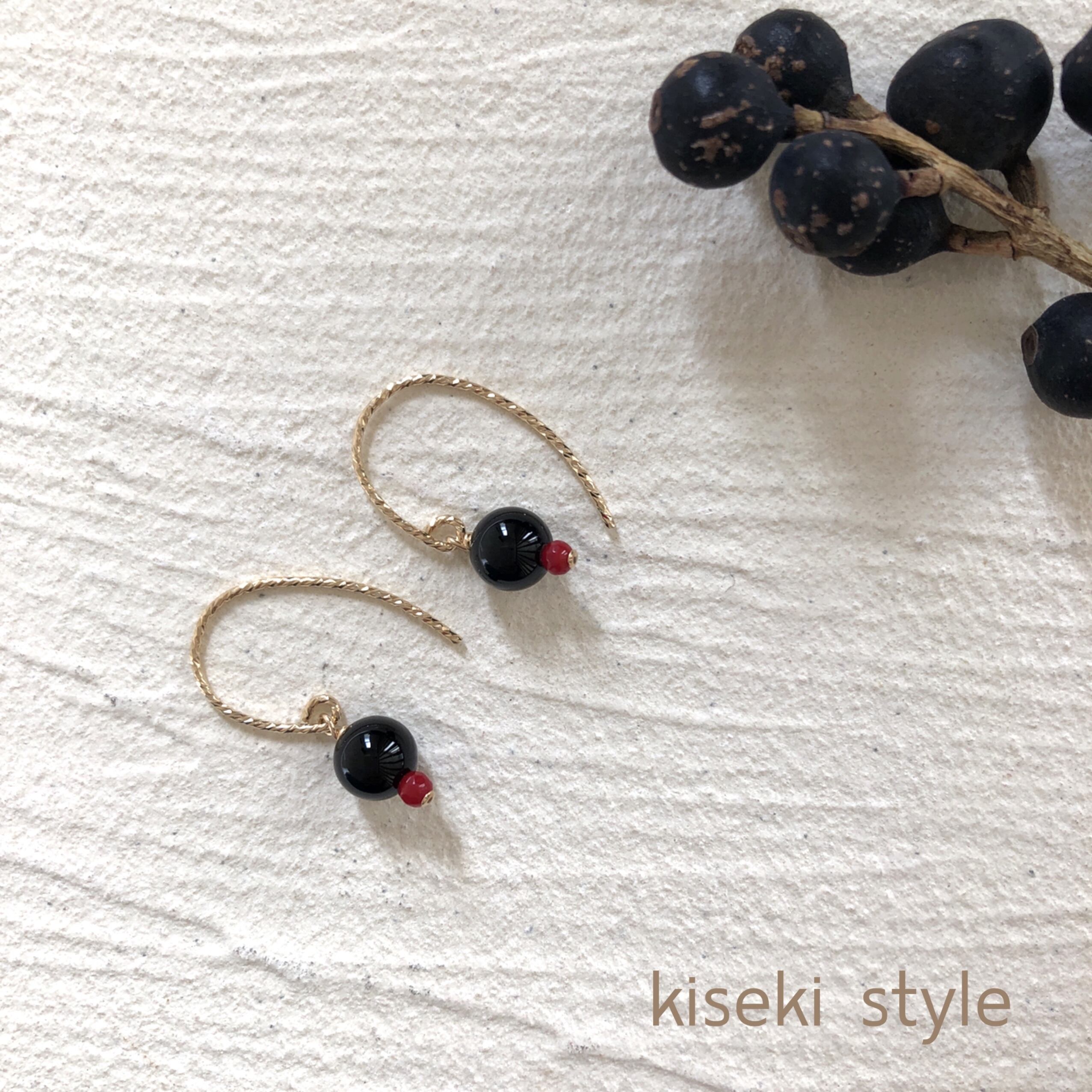 黒の代表的な天然石で艶のよい美しいオニキスと、レッドコーラルのシンプルピアスです。