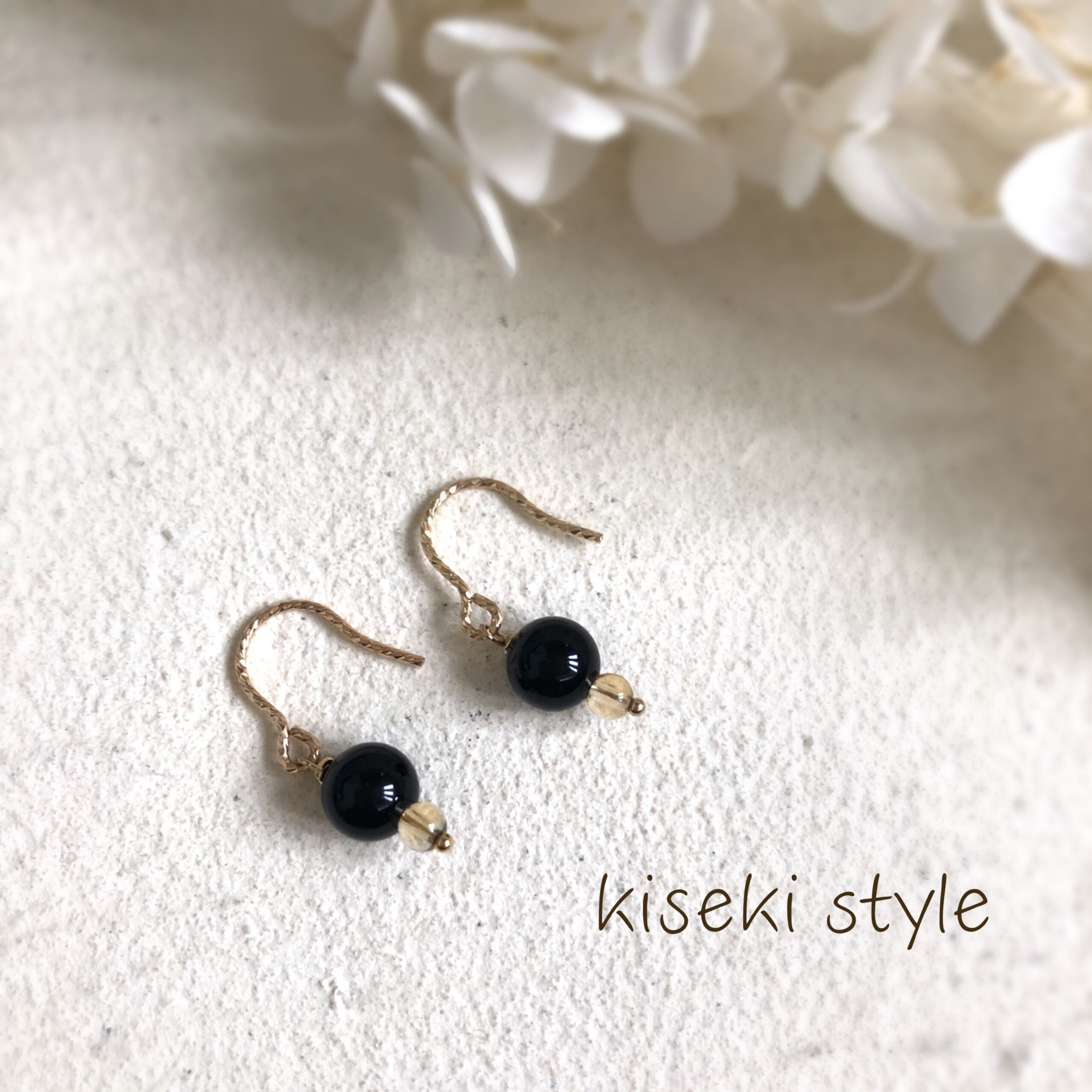 黒の代表的な天然石で艶のよい美しいオニキスと、シトリンのシンプルピアスです。